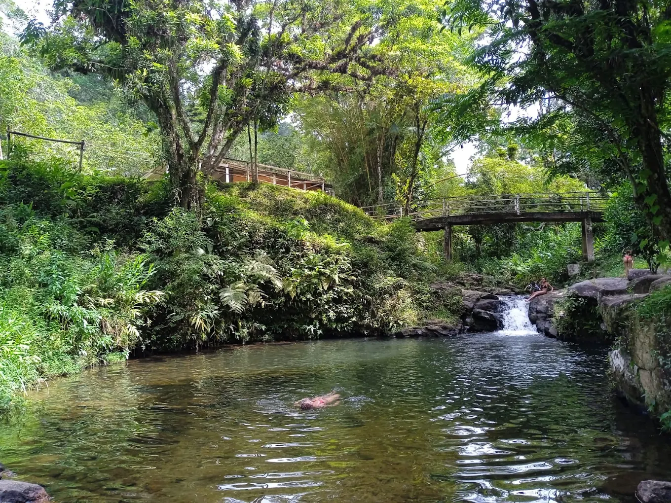 Piscina natural de nascente no Parque da Serra do Mar, em Peruíbe, com água que muda do verde-esmeralda para o azul-turquesa conforme o sol.